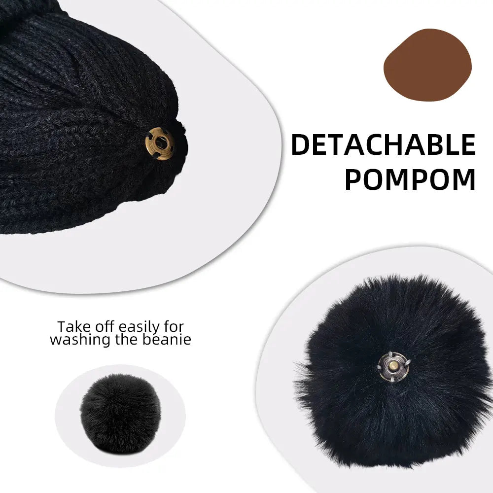 Beanie Hat Bluetooth Wireless Headphones, Bluetooth Knitted Beanie Faux Fur Hat Pom Detachable Ball Cap for Women Men Boys Girls