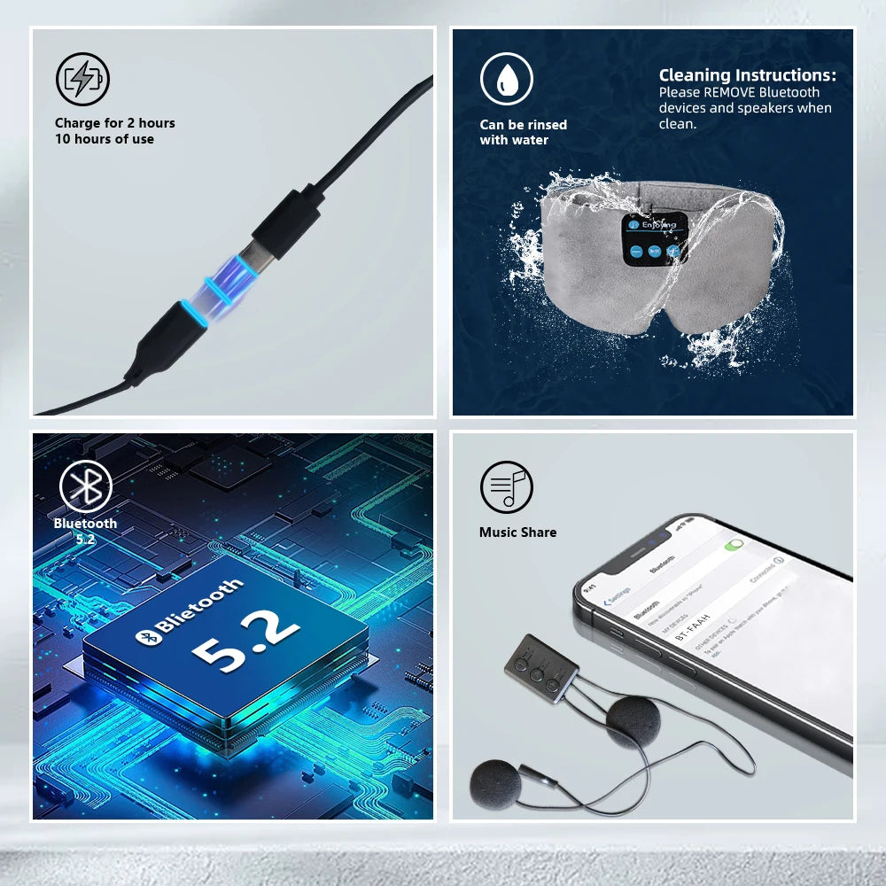Bluetooth sleep mask equipped with high-quality stereo speakers and microphone for hands-free and clear phone calls, enjoy music. Bluetooth 5.2 pairs with most devices greatly improves convenience.